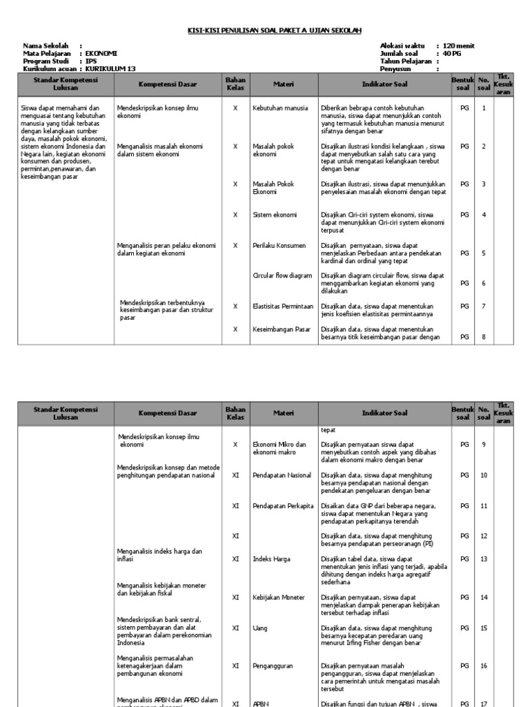 Peserta didik mampu menjelaskan peran teknologi dalam pembangunan ekonomi. Kisi kisi uas ekonomi kelas x xi xii semester 1 kurikulum 2013 dan ktsp 20172018 ini merupakan file yang akan saya bagikan dalam postingan. Ini dapat digunakan sebagai acuan oleh guru kelas maupun guru mapel penjaskes atau pai di sekolah dasar dalam menyusun kisi kisi soal baik soal ulangan harian pas danatau pat. 120 menit jumlah soal : Tabel 3.4 contoh stimulus ekonomi kelas x. Membuat petunjuk umum dan khusus untuk mengerjakan soal. Rumusan masalah aspek yang diukur indikator. Tabel 3.4 contoh stimulus ekonomi kelas x. Kisi kisi sejarah kelas x source : 120 menit jumlah soal/bentuk : Contoh penjabaran kd 21 tabel 3.5 : Kisi kisi uas ekonomi kelas x, xi, xii semester 1 kurikulum 2013 dan ktsp 2017/2018 ini merupakan file yang akan saya bagikan dalam postingan kali ini untuk menunjang kewajiban guru dalam menyusun soal ujian. Contoh format pembuatan kisi kisi soal ulangan by.
